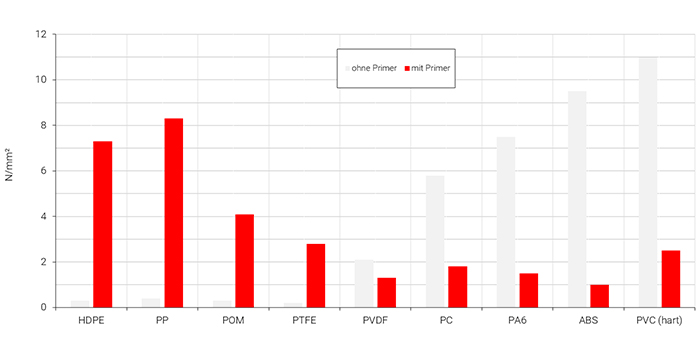 Für unpolare Kunststoffe wie PA 12 / PE / PET / PI / POM / PP / PTFE / oder TPE steht ein entsprechender Primer zur Verfügung. Durch den Einsatz des Primers 5150 können auch diese unpolaren Kunststoffe